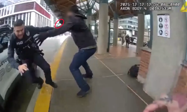 BELLEVUE, Wash. — Newly released video shows a man ambushing Bellevue police officers with a knife after allegedly luring them to a transit center with a false 911 call, KOMO reported.
