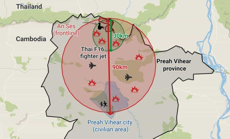 In a statement, the ministry said Thai military units launched 15 attacks over ten hours, beginning at 4.30 in the morning and continuing until 2.42 in the afternoon. It claimed that Thai F-16 aircraft dropped bombs as far as 70 kilometres inside Cambodia, near an area sheltering displaced civilians.