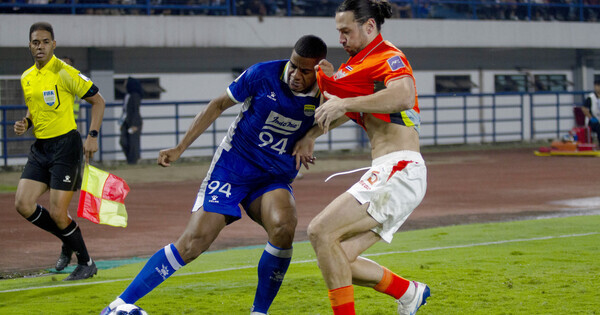 (260219) — BANDUNG, Feb. 19, 2026 (Xinhua) — Uilliam Barros Pereira (C) of Persib Bandung vies with Daniel Ting of Ratchaburi FC during the AFC Champions League Two knockout stage football match between Persib Bandung of Indonesia and Ratchaburi FC of Thailand in Bandung, Indonesia, Feb. 18, 2026. (Photo by Septianjar Muharam/Xinhua)