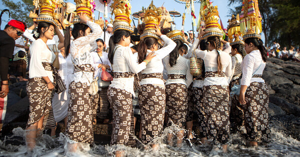 (260316) — BALI, March 16, 2026 (Xinhua) — People participate in a Melasti ceremony in Gianyar Regency, Bali, Indonesia, on March 15, 2026. Hindu devotees in Indonesia held the Melasti ceremony before celebrating the Nyepi Day, the Balinese Day of Silence. According to the Balinese calendar, Nyepi Day is a holy day that ushers in the Hindu New Year. (Photo by Lana Prima/Xinhua)